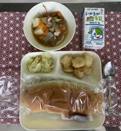 いかの天ぷら、フレッシュトマトのスープ煮、キャベツとコーンのソテー、コッペパン、いちごジャム、牛乳です。