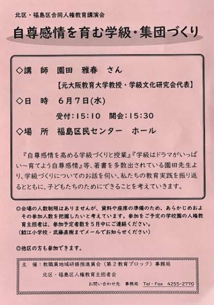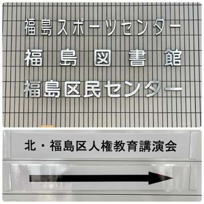 本日、午後3時30分より福島区民センターで「北区・福島区合同人権教育講演会」に教職員が参加します。