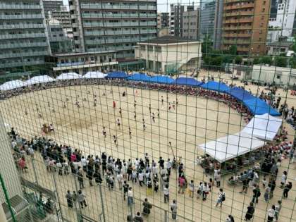 グラウンドでは、大淀小学校が運動会を開催されています。たくさんの保護者、地域の方々に見守られながら活気のある運動会です。