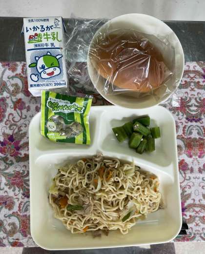 和風焼きそば、オクラの甘酢あえ、抹茶大豆、黒糖パン(ハーフ)、牛乳です。