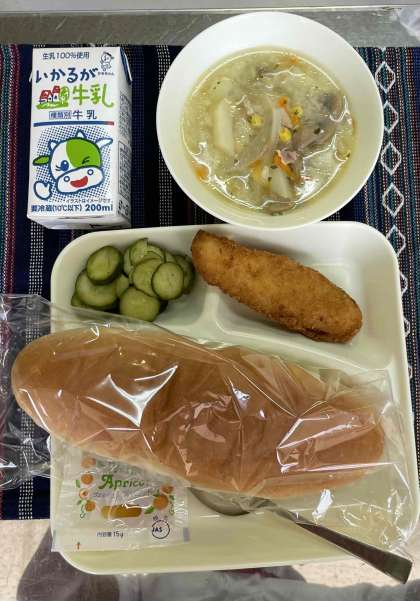 サーモンフライ、豆乳スープ、きゅうりのバジル風味、コッペパン、アプリコットジャム、牛乳です。