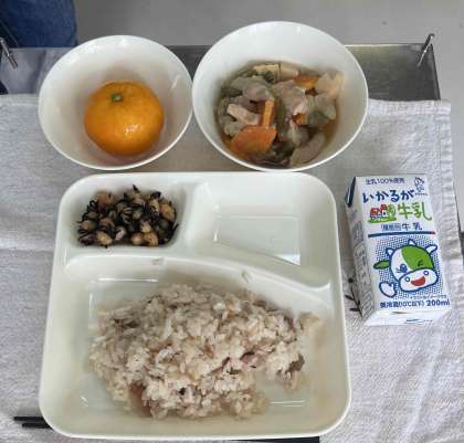 かやくご飯、鶏肉と野菜の煮物、ひじき豆、みかん(冷凍)、牛乳です。