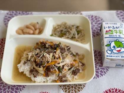 牛丼、モヤシとピーマンの胡麻炒め、大福豆の煮物、牛肉です。