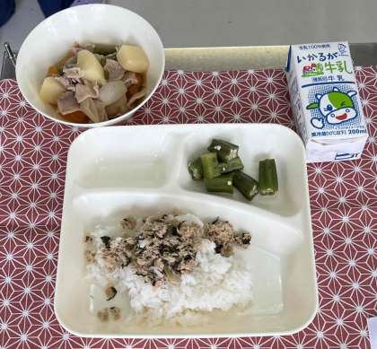 豚肉とじゃがいもの煮物、オクラと梅風味、ツナっ葉いため、ご飯、牛乳です。