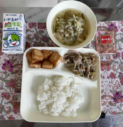 ゴーヤチャンプル、五目汁、あつあげのしょうが醤油、ごは、牛乳です。