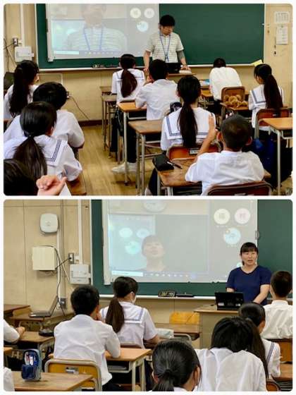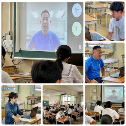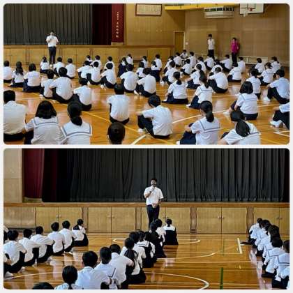 1年生は、各クラスの教室から4クラスをリモートで繋いで、双方向で学年集会を行いました。2年生は体育館で対面で行いました。とてもしっかり話を聞いていました。3年生は1組隣の学習室から、3クラスにリモート配信していました。