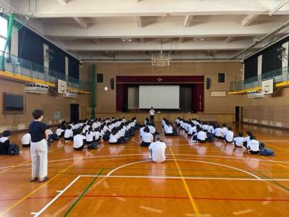 1年生の生徒は、本日9時より体育館で平和学習「大阪大空襲」を行いました。