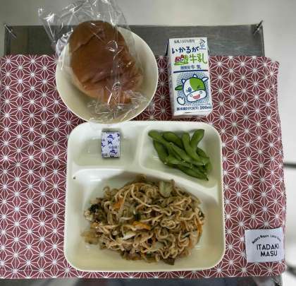 オイスターソース焼きそば、枝豆、固形チーズ、黒糖パン(ハーフ)、牛乳です。