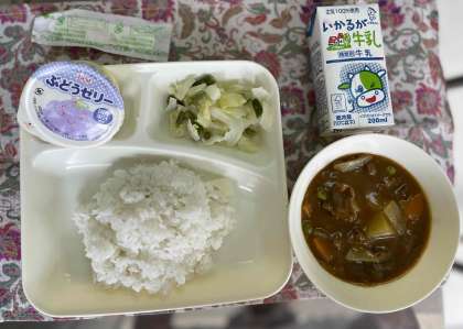 ビーフカレー(米粉)、野菜のピクルス、ぶどうゼリー、牛乳です。