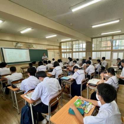 今週から、3週間にわたって教員の相互授業参観が行われます。1時間目は2年1組で五十嵐先生の社会科研究授業が行われています。