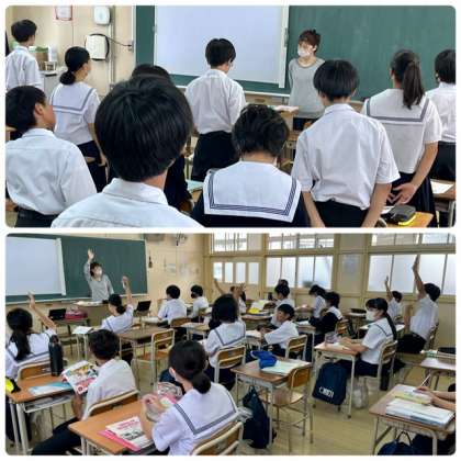 3時間目、深江先生が1年1組で英語科の研究授業を行いました。「疑問詞whoの理解と活用」をめあてに学習しました。1組の生徒はとても明るく、先生の問いかけに反応していました。楽しい英語の学習はいいですね。