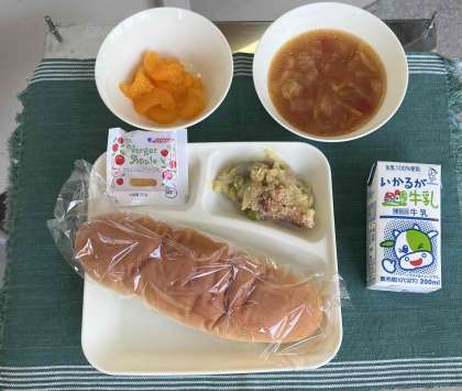 豆乳マカロニグラタン、トマトスープ、コッペパン、りんごジャム、みかん(缶)、牛乳です。