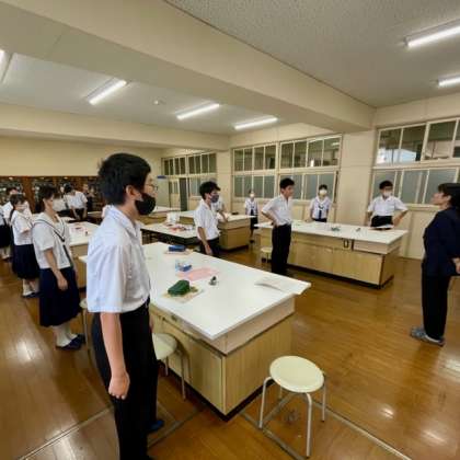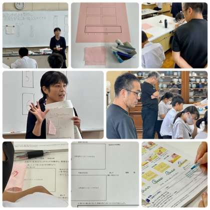 4時間目、上木先生の家庭科1年生の研究授業を行いました。「用具を安全に取り扱い、丈夫なランチマットを作成する」をめあてに1年3組で学習を進めています。