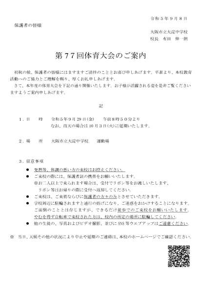 本日、生徒を通じて「第77回体育大会のご案内」を配付いたしました。保護者の皆様におかれましては、ご確認ください。