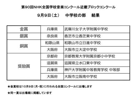 本日、開催された「第90回全国学校音楽コンクール近畿ブロックコンクール」(近畿大会)の結果がNHKのホームページに掲載されました。