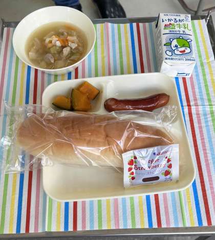 ウィンナーケチャップソース、スープ、焼きカボチャ、コッペパン、いちごジャム、牛乳です。