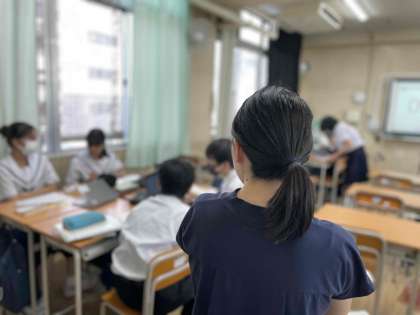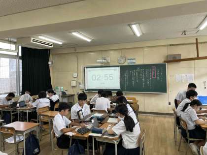 生徒たちは個別に一人一台端末でパワーポイントを作成し、班活動でそれぞれが発表しています。生徒たちが主体的に取り組む新学習指導要領に基づいた授業展開です。