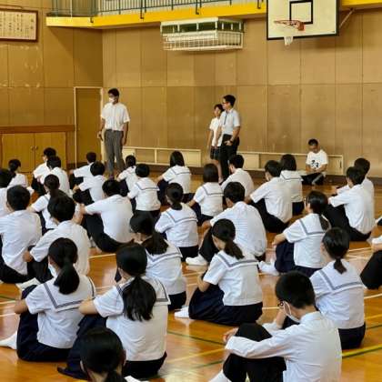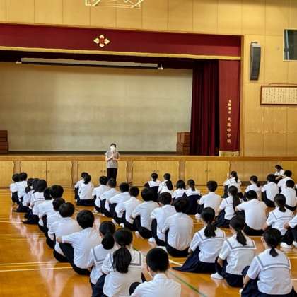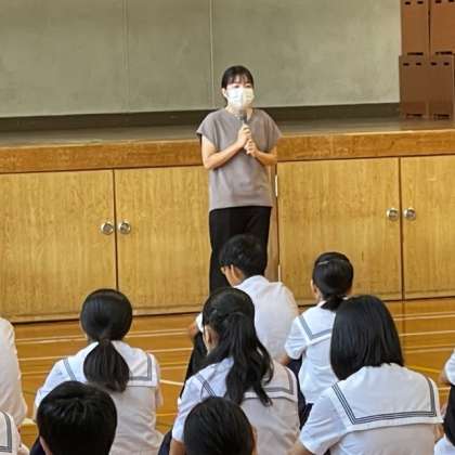 2年生の学年集会の様子です。本校校区在住で思斎支援学校に通学している生徒が「居住地交流」で、本校の授業体験に来てくれました。小学校時に顔馴染みの人も懐かしく思っていたようです。