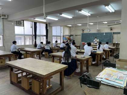 2限、1年4組、技術の授業です。本校では、技術科と家庭科、分割で少人数授業を展開しています。