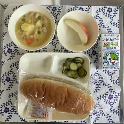 豆乳コーンクリームシチュー、きゅうりのバジル風味、りんご、コッペパン、アプリコットジャム、牛乳です。