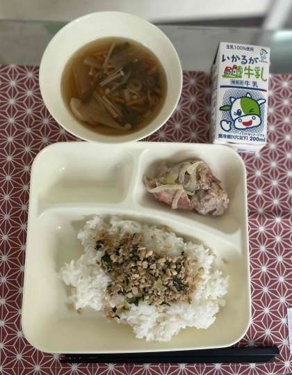 鶏肉のゆず塩焼き、ソーキ汁、ツナ大豆そぼろ、ご飯、牛乳です。