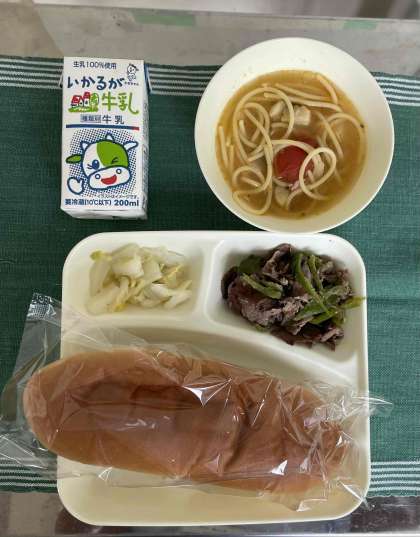牛肉の香味焼き、ほたて貝とトマトのスープスパゲッティ、はくさいのピクルス、黒糖パン、牛乳です。