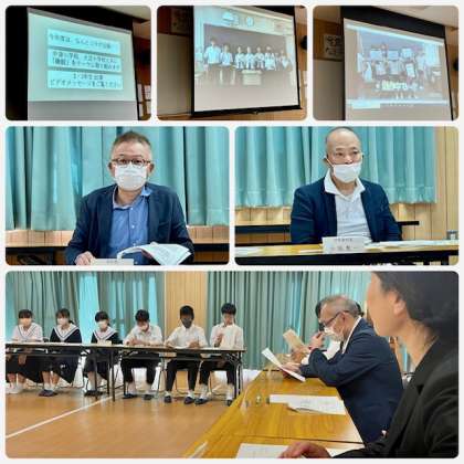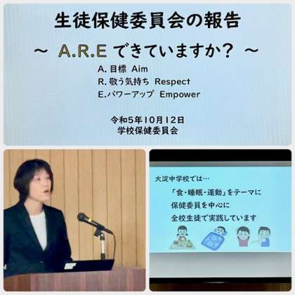 昨日(10月13日)午後2時から、多目的室で校医の吉本先生、小坂先生をお迎えして学校保健委員会を開催しました。生徒代表(3年保健委員)、保護者代表(PTA役員)、教職員代表が参加しました。最初に指導養護教諭から生徒保健委員会の報告「A.R.E.できていますか?」が発表されました。生徒保健委員会が行った調査をもとにSDGsの目標に照らして、給食の残食について現状の提起がなされました。パンの残食や牛乳の残食が課題です。また、継続的に行われている睡眠調査の結果も報告いただきました。今年は、校区内の小中学校でともに取り組むことが話されました。これらを受けて、協議を行いました。