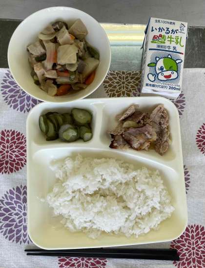 豚肉のねぎじょうゆ焼き、ふき寄せ煮、きゅうりの甘酢づけ、ご飯、牛乳です。