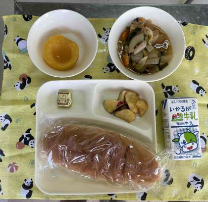 豚肉とイカの中華煮、大学いも、黄桃(缶詰)、コッペパン、バター、牛乳です。