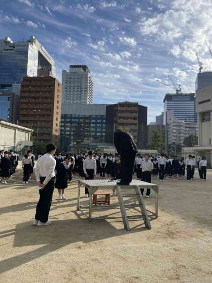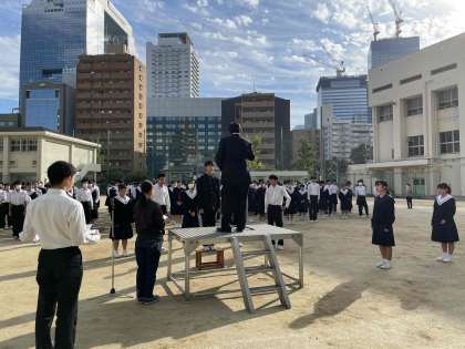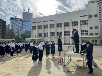 毎週月曜日は全校集会です。校長先生と朝の挨拶、後期学級委員長の認証式、表彰伝達と続きます。