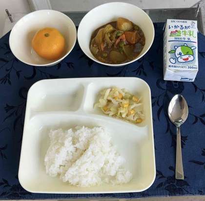 ポークカレーライス、サワーソテー、みかん、牛乳です。