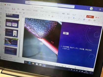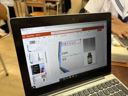 各自で考えて実験した物質の区別の方法と結果をスライドショーにしてまとめています。