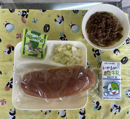 タンタンめん、あっさりキャベツ、黒糖パン、牛乳、まっ茶大豆です。