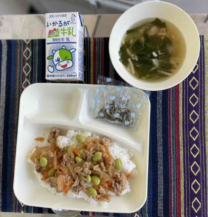 ピリ辛丼、中華スープ、ご飯、ミニフィッシュ、牛乳です。