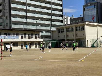 今日は身体測定のため、時間割が逆順です。2限目、男子はサッカー、女子はバレーボールをしています。