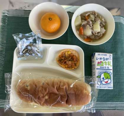 豚肉と野菜のスープ煮、変わりピザ、みかん、ミニフィッシュ、おさつパン、牛乳です。