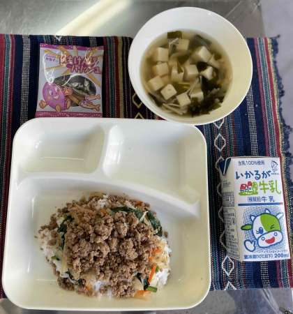 ビビンバ(ご飯)、わかめスープ、芋けんぴフィッシュ、牛乳です。