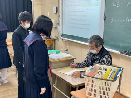 2年1組理科の学習です。西澤先生にプリントの点検していただいています。
