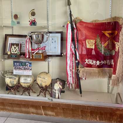 昨日、全校集会で披露・伝達した「大阪市中学生親善ソフトボール大会 優勝」の表彰状、優勝旗、優勝カップが玄関ホールの表彰棚に飾られました。
