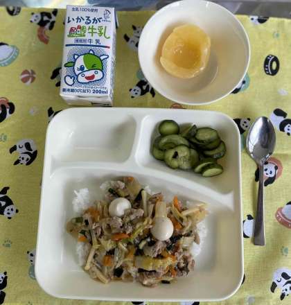 中華丼(ご飯)、きゅうりのピリ辛、白桃(缶)、牛乳です。