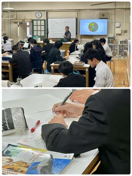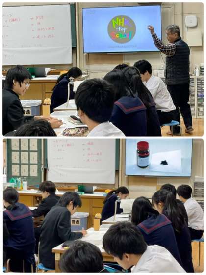 2年理科の学習です。ビデオ教材で金属について学習しています。大型ディスプレイはとても綺麗で見やすく、色の変化などがわかりやすいです。