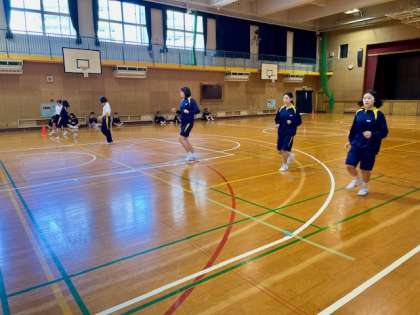 体育館では、2年生女子がシャトルランをしていました。全国体力・運動能力運動習慣調査から半年が過ぎました。この半年間の運動能力の向上を確認していました。
