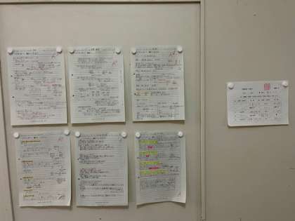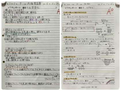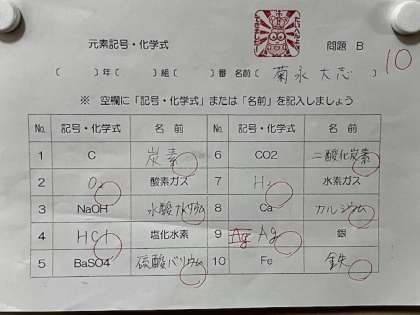 2年理科の学習レポートの優秀作品が、階段ホールに展示されていました。どのレポートもよくまとめられています。レポートの苦手な生徒に参考にしてもらえれば、みんなが高まります。よく見ると菊永先生の元素記号小テストも張り出されていました。見事満点です。
