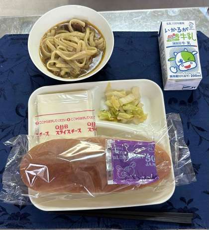 カレーうどん、白菜のおひたし、コッペパン、ブルーベリージャム、スライスチーズ、牛乳です。