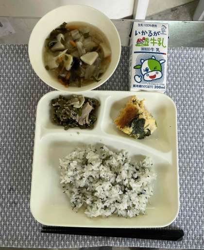 具だくさん卵の千草焼き、五目汁、豚肉とさんどまめの炒めもの、菜飯、牛乳です。
