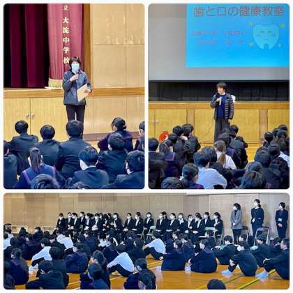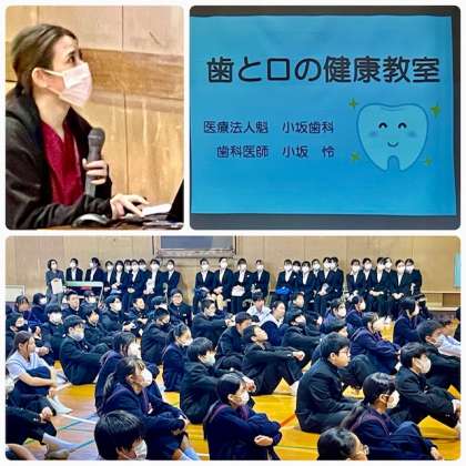 6時間目、1年生は体育館で「歯と口の健康教室」を実施しています。講師はいつも歯科検診でお世話いただいている小坂歯科から小坂 怜 先生が来てくださっています。