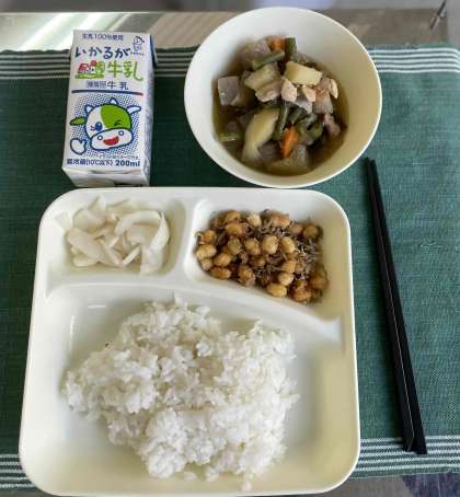 鶏肉と野菜の煮もの、じゃこ豆、かぶのゆず風味、ご飯、牛乳です。