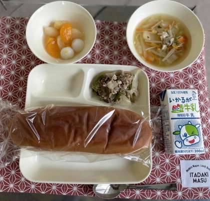 豚肉と野菜のソテー、はくさいのスープ、黒糖パン、フルーツ白玉、牛乳です。