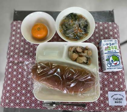 鮭のマリネ、肉団子と麦のスープ、みかん、黒糖パン、牛乳です。