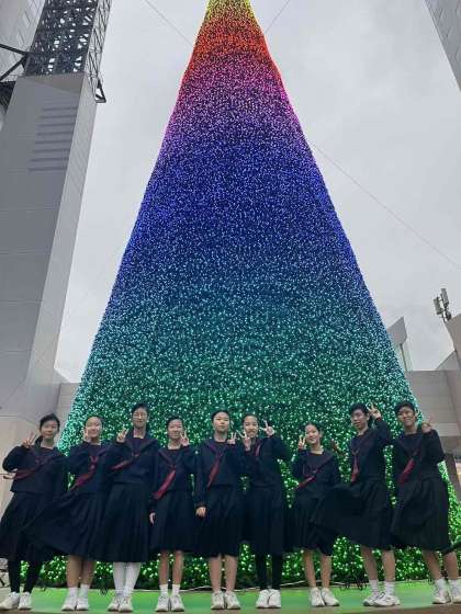 そして、12月16日(土)にスカイビルのクリスマスツリー点灯式で演奏をしました。ビル風吹き荒れる中、頑張りました。ハンドベル演奏もさせていただき、本当によい機会となりました。一般のお客様にもたくさん聞いてもらえたことも嬉しかったです。合唱部の皆さん、よく頑張りました。